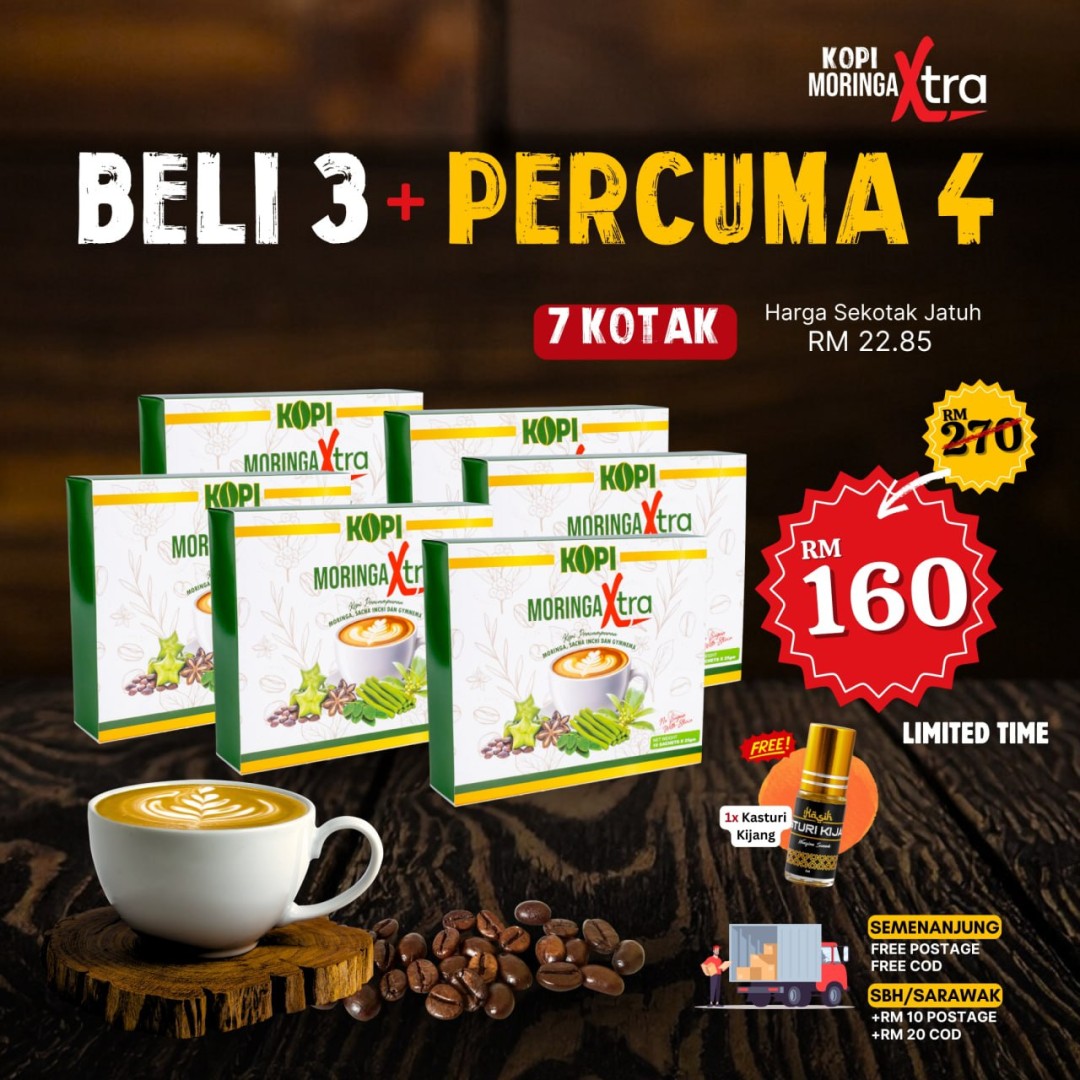 KOPI MORINGA XTRA - 3 KOTAK + PERCUMA 4 KOTAK + 1 KASTURI KIJANG (7 KOTAK)
